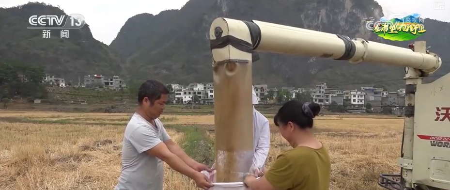 正在河池市凤山县一处1800亩的麦田里,这里试种的小麦曾经成熟,轻飘飘的麦穗将麦秆压弯了腰。收割机正正在麦田间穿越,加紧收割功课。